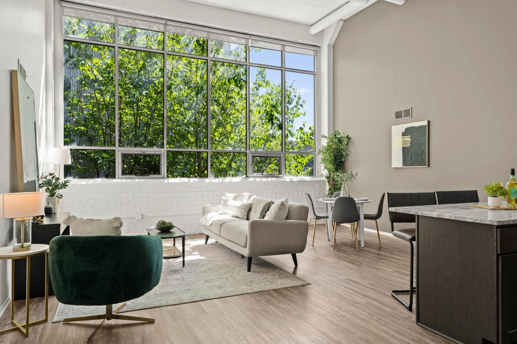 NEW PRICE for Unit 215 at Sixty Spring, a unique opportunity to live in one of Downtown Columbus's most iconic historic buildings—with a rare courtyard-facing view. Imagine waking up each morning to the sight of lush greenery and a tree right outside your floor-to-ceiling windows, all while surrounded by the character and strength of true industrial design. This stunning two-story condo boasts 20-foot ceilings, exposed ductwork, and poured concrete floors with 2 feet of sound-buffering between units, giving you privacy and peace in the heart of the city. The open-concept living space is bathed in natural light from the oversized windows, with direct views of the peaceful gated courtyard. The remodeled modern kitchen features stainless steel appliances, an island with breakfast bar, and sleek countertops. Each level includes a spacious bedroom, walk-in closet, and full bathroom. The upstairs loft is perfect as a second bedroom, office, or creative space. In-unit laundry is conveniently located on the second floor. Additional highlights include a secured underground parking space, rooftop patio with city views and grill, a lobby coffee bar, elevators, and unbeatable walkability to Downtown's best breweries, restaurants, shops, and office spaces. Agents see A2A!