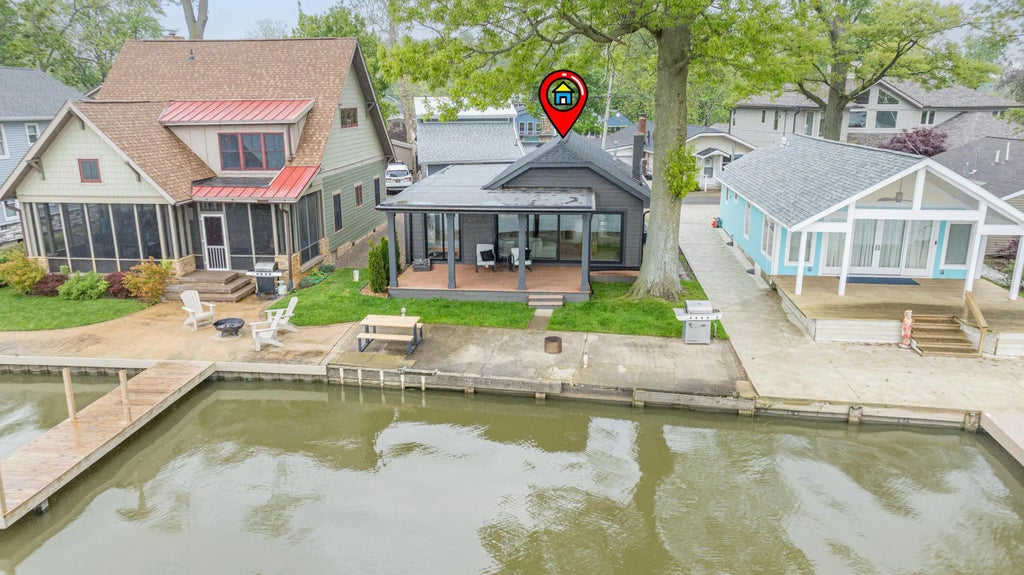 Modern lakefront luxury meets timeless tranquility in this beautiful, fully renovated getaway nestled along the shoreline. With bold curb appeal, this dark-toned exterior is both sleek and inviting, leading into a home that radiates contemporary elegance and panoramic water views from nearly every room. A wonderful, covered deck with ceiling fan invites you to enjoy summer evenings in comfort, while floor-to-ceiling sliding glass doors seamlessly blend indoor and outdoor living—offering uninterrupted views of the sparkling lake just steps away. Inside, the living space is bright and airy with vaulted ceilings, light-toned luxury vinyl plank flooring, and a crisp white palette that reflects the natural light pouring in from the wall of windows. The open-concept great room centers around a stunning marble-accented feature wall with built-in shelving and a mounted flat-screen. The kitchen is exceptionally nice; featuring white cabinetry, a massive quartz waterfall island with wood-accented bar stools, and high-end black appliances—including a modern gas range. Every inch of this space has been carefully designed for form and function. In the bedroom, neutral tones offer a serene escape, while smart layout choices maximize comfort and style. The modern design continues in the bathroom with clean finishes and ample natural light. Step outside to a backyard that puts you right on the water's edge, with a well-maintained seawall, room for a dock or lift, and lush green space perfect for lakeside lounging. Situated in a peaceful cul-de-sac surrounded by water, this home also offers a sense of privacy rarely found in lakefront living—all just moments from local dining, marinas, and recreation. New roof in 2024. Furniture is negotiable. This home is currently being used an AirBnB. The income for 2023/2024 was approximately $46,000.