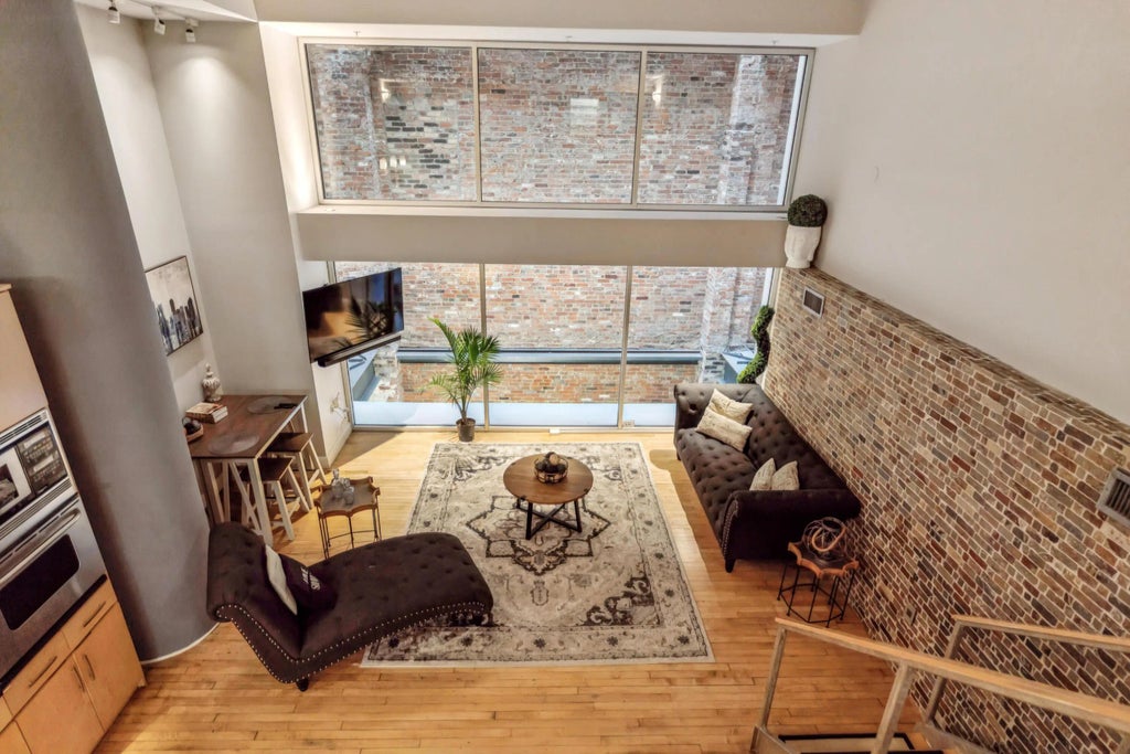 Discover modern downtown living in this stylish 2-bedroom, 2-bath loft condo in the Atrium Lofts—a true urban retreat nestled in the heart of Downtown Columbus. This impressive two-story unit showcases soaring ceilings, exposed brick walls, and an open mezzanine view that fills the home with light and character. The main level features a spacious living and dining area with dramatic floor-to-ceiling windows overlooking the atrium, complemented by warm hardwood flooring and industrial architectural details. The kitchen is equipped with stainless steel appliances including a stove, microwave, dishwasher, and wine cooler, offering functionality within a sleek minimalist design. Upstairs, the primary suite provides a cozy retreat with plush carpeting, a full en-suite bath, and a perfect view of the main living space below. The second bedroom and additional full bath on the entry level make for an ideal guest room or home office. Enjoy secure building access, modern finishes, and proximity to Columbus Commons, the Arena District, and some of the city's best dining and nightlife—all just steps from your door. Sale intended to satisfy the mortgage payoff at closing; see A2A for payoff/coordination notes.