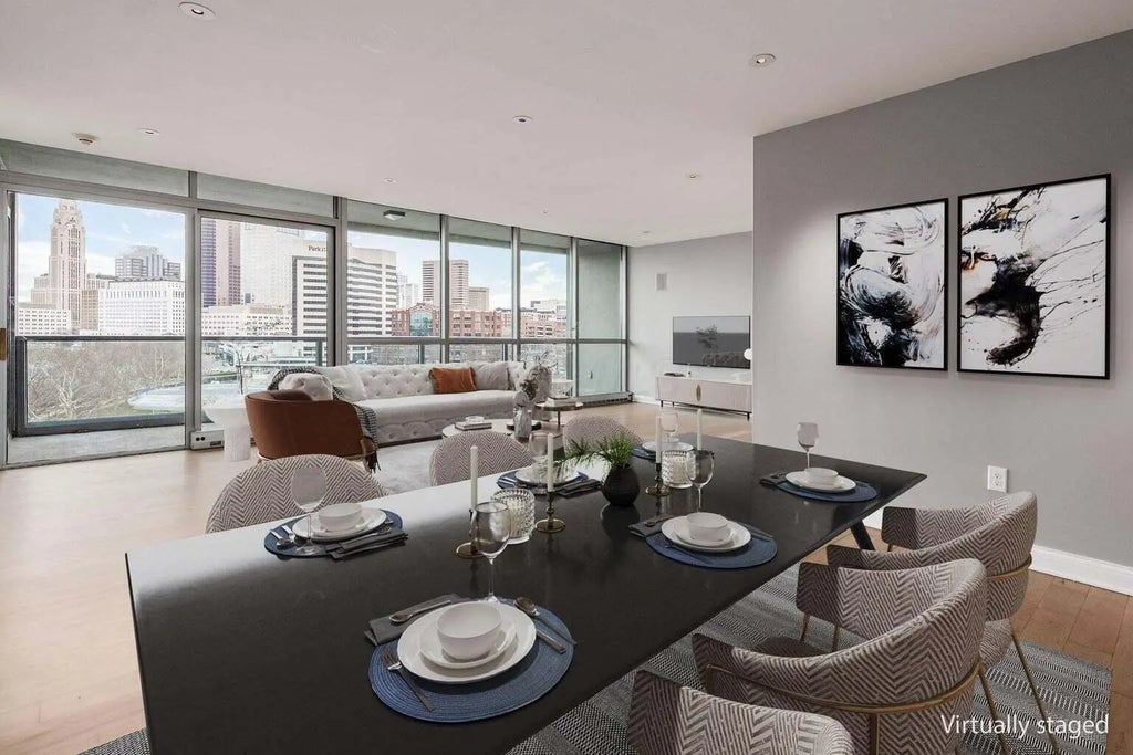 Luxurious 7th floor unit overlooking Columbus skyline with river views, open floor plan, floor to ceiling glass windows, large primary suite, 24 ft balcony, refinished wood flooring, and fresh paint throughout. Kitchen has stainless steel appliances, refinished cabinets, and built-in custom bar. Primary suite includes walk-in closet, motorized blinds, brand new carpet, linen closet and jacuzzi tub. Large utility room with washer/dryer and sink. 2 parking spots and additional storage room located in the building. Association dues are included: 24/7 concierge, social rooms, fitness, sauna, steam room, pool and more. Water and gas also included. Tenant pays electric. Minimum Household Income to be 3x rent. Minimum credit score of 625. Applicants must consent to background check.